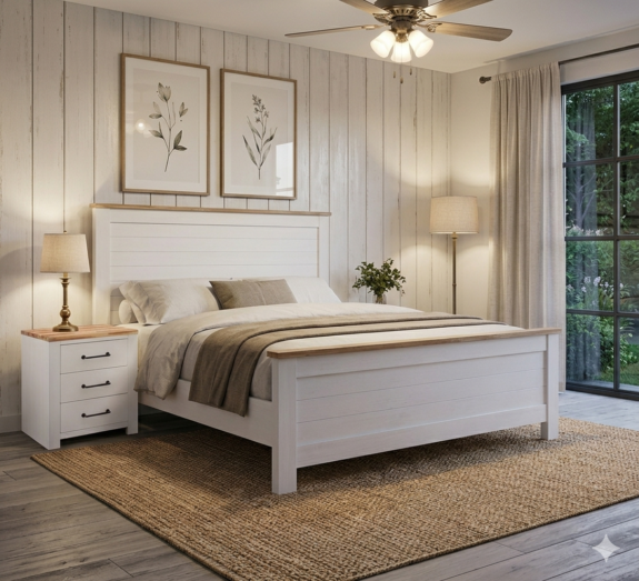 清潔感あふれるホワイトのフレームに、あたたかみのある天然木のアクセントを添えました。まるで高級リゾートのヴィラにいるような、開放的で落ち着いた寝室を演出します。 お気に入りのリネンを重ねて、自分だけの特別な空間を完成させてください。